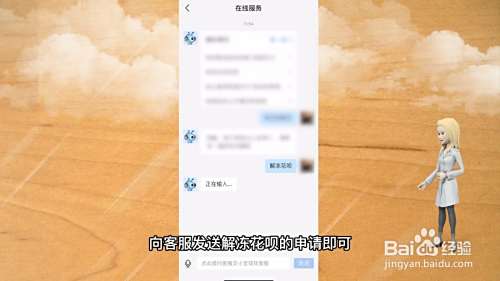 打开手机支付宝的我的进入,点击客服图标,进入点击在线服务,向客服发送解冻花呗的申请即可。具体操作方法如下:
