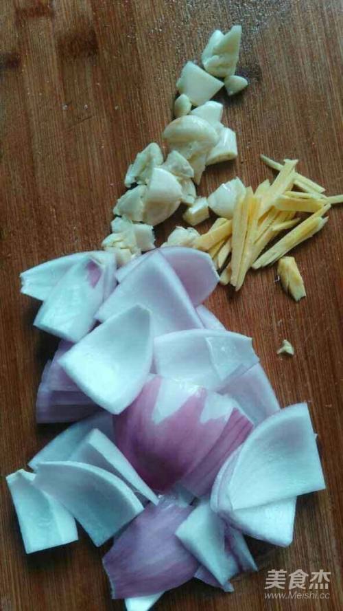 6洋葱洗净切小块;姜去皮洗净切丝;大蒜籽去皮洗净切碎