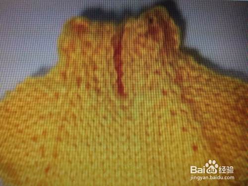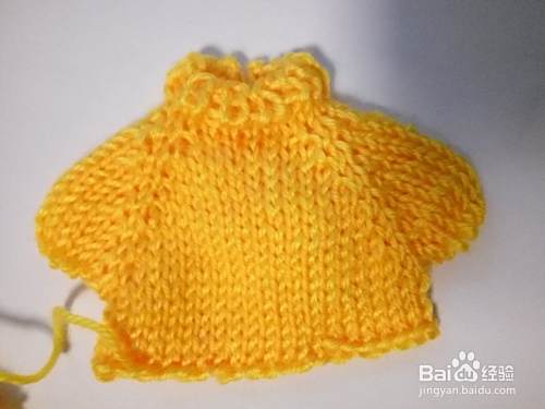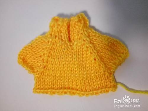 织到领子需要的长度后开始织下针,同时开始分针。分前胸、后背、双肩3个部分;其中前胸6针,后背6针(分开处各3针),双肩个3针。前胸、后背、双肩分别用4根针穿着线正面织下针,反面织上针。