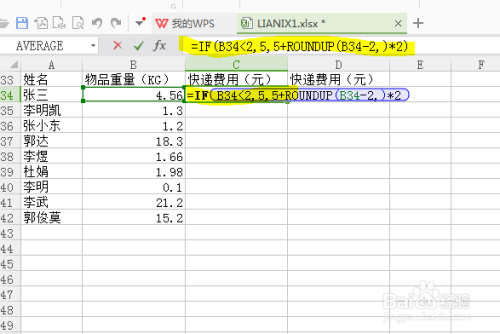 excel的计算方式是很灵活的,当然也可以借助于if和ceiling函数来完成快递费用的计算,其公式输入如下所示: