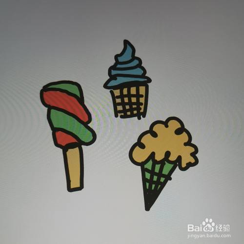 最后,给它涂上蓝色和黄色,这样就画好三个冰激凌啦。