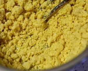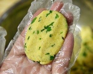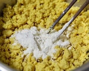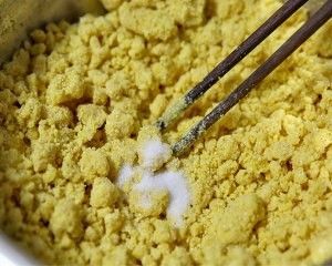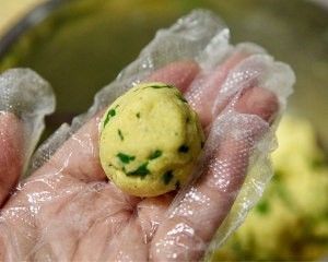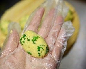 酵母液体要在烫过的玉米面晾至手温以后再加入。加完芹菜叶搅拌均匀后的醒发也是为了使小贴饼子稍微喧软一点儿。也可以等到面团完全发酵再烙