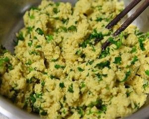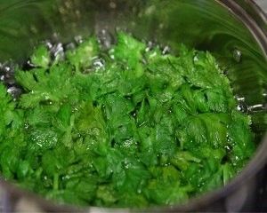 芹菜叶挤净水分,切成碎末,加入面团中,用筷子搅拌均匀,成湿面团,像小葱拌豆腐的软硬程度