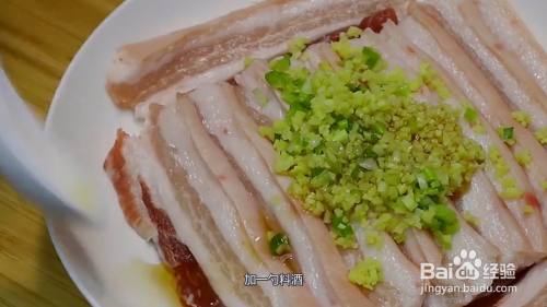 五花肉切成条状,倒入葱末,加一勺料酒,一勺生抽,小半勺老抽。