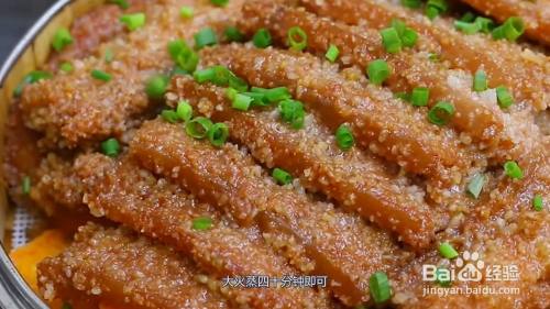 将五花肉腌制后,裹上农家蒸米粉,铺在蒸笼里的红薯上,蒸煮四十分钟,即可起锅食用。