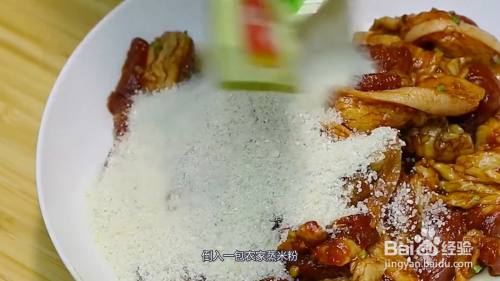 用手将配料抓均匀后,倒入一包农家蒸米粉,倒入清水搅拌均匀。
