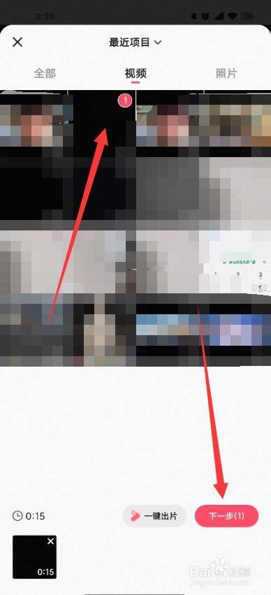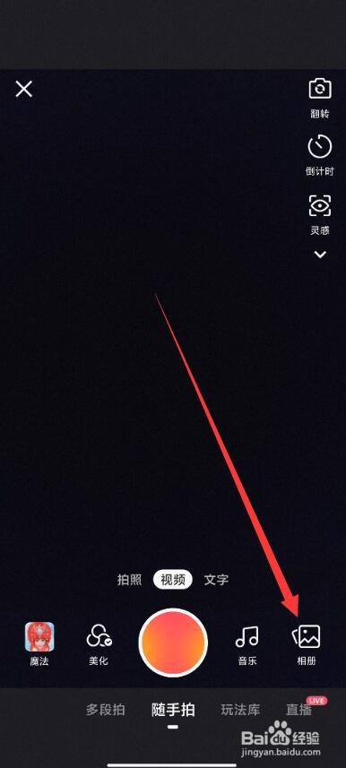 在拍摄界面点击【相册】,选择一个视频,点击【下一步】。