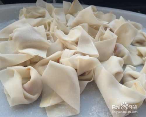 2.买来的混沌皮一片切或撕成四块、包入虾馅,捏好!做好的不想马上煮的就放冰箱急冻,要煮的用骨汤烧开煮熟就可了,可以下点紫菜或青菜!