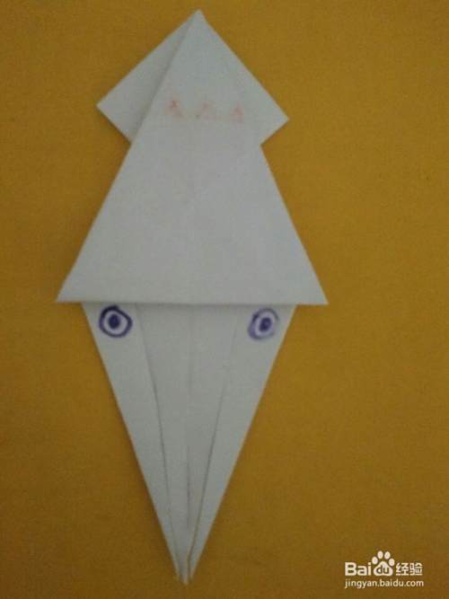 用剪刀沿着虚线剪开后,翻过来,用彩笔画上眼睛,乌贼折好了。
