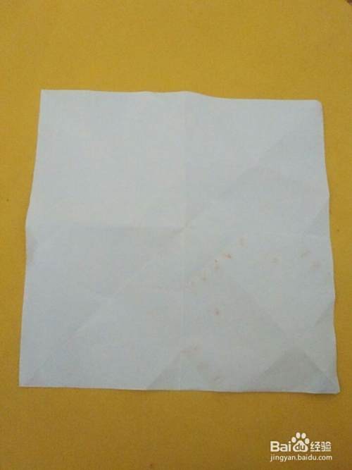 准备一张正方形的纸,沿中心线上下对折,之后左右对折,全部展开。接下来,沿两条对角线分别对折后,展开,铺平,如图所示。