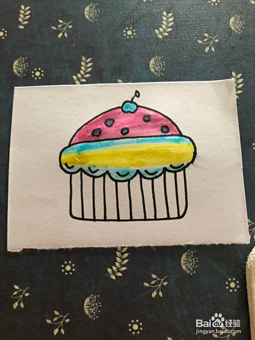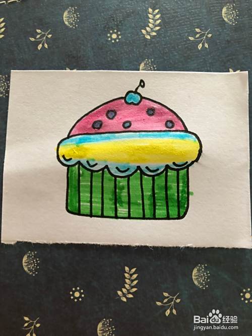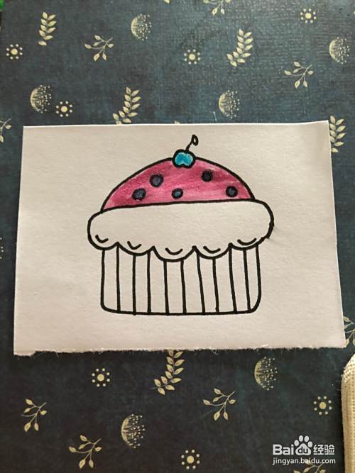 小蛋糕在第三部就我们就已经画好了,接下来我们需要选用水彩笔,建议大家可以选用水彩笔,因为他颜色更加亮丽,适合小朋友选用粉一点的粉色涂上,因为这个蛋糕是草莓味道的,再加上蓝色的蓝莓。
