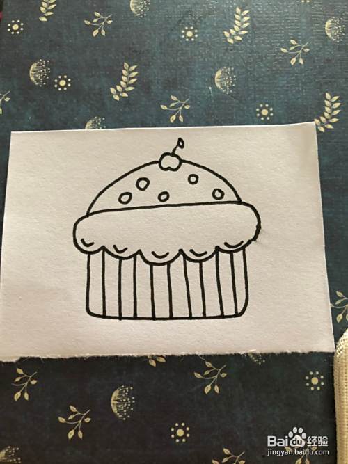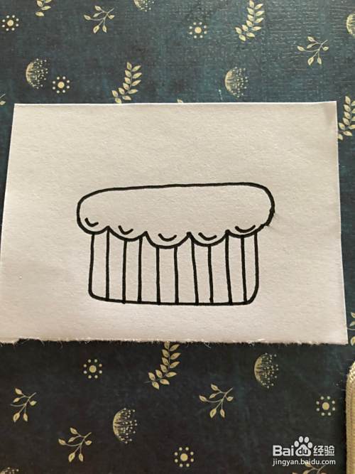 大家都知道小蛋糕呢,他是有纸杯蛋糕的,那么我们现在第二步就需要把蛋糕杯子画出来他呢,在画画中是选用类似于长方形的,再加上一些小条纹如图所,是这样几杯酒画出来了。
