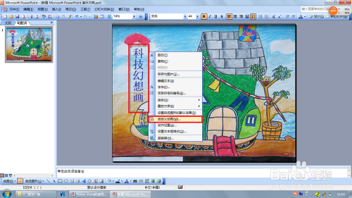 选中文字,单击鼠标右键,选中“自定义动画”,如下图。