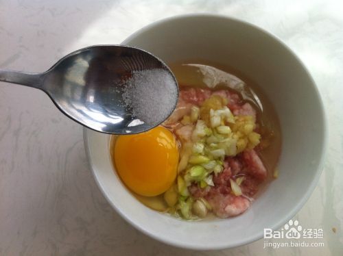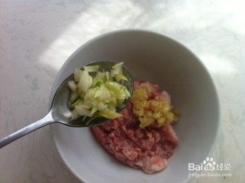 首先,猪肉馅的碗里,加入姜,葱,再添加少许干淀粉,打入一个鸡蛋,最后加入少许盐、生抽和香油,顺时针搅拌均匀,盖上保鲜膜,放入冰箱,入味。