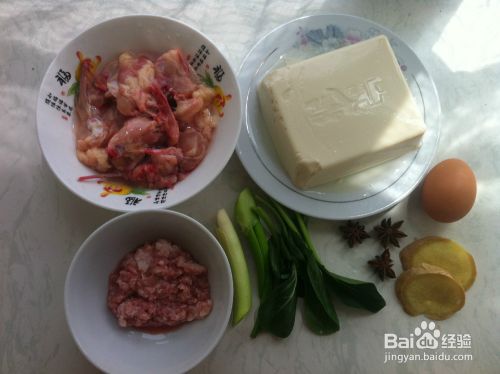 将鸡骨架洗净装碗,猪肉馅装碗,豆腐略冲一下装盘,所有食材准备就绪,开动。
