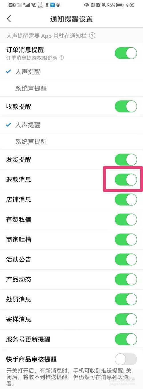 进入新页面,将“退款消息”后面的按钮滑动至绿色。