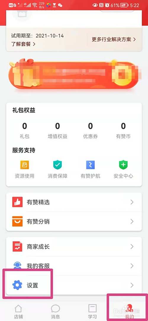 打开手机有赞微商城app,点击右下角“我的”,进入新页面,向下滑动点击下方的“设置”。