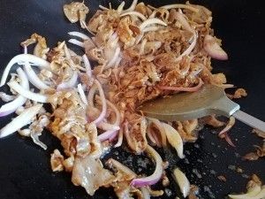 倒入洋葱翻炒至五成熟,加入孜然和少许盐快速炒匀。