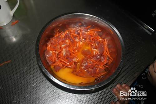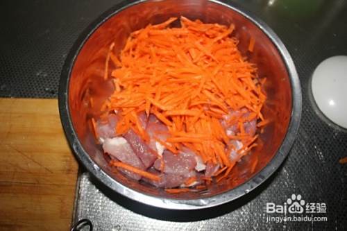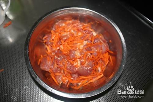 把肉切成大丁块胡萝卜切丝。