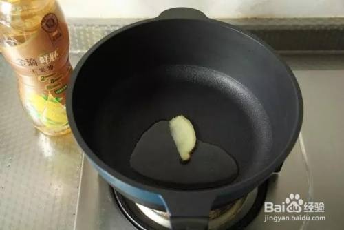 2、不粘锅中,倒入金龙鱼金滴鲜胚玉米油,然后开火将玉米油烧热,放入姜片,翻炒一会爆香。