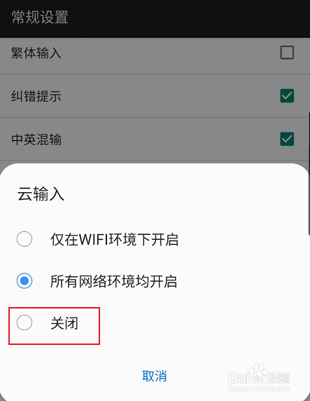 百度输入法选择我的找到设置选择常规设置进入找到云输入即可关闭