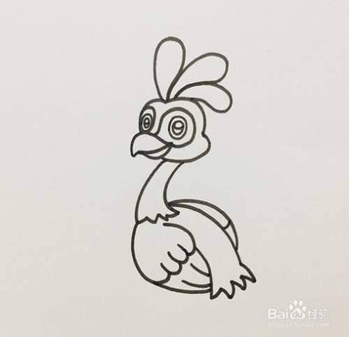 接着画出孔雀的躯干,躯干比头稍微大一点,画出孔雀两只一前一后大小不一的翅膀。