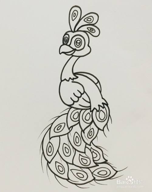 然后画出孔雀漂亮的尾巴,尾巴稍微有些复杂,要仔细一点。