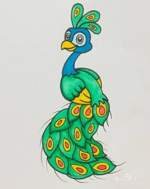 给孔雀涂上颜色,一只又简单又漂亮的孔雀就画好了。
