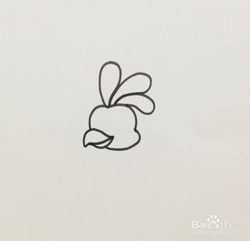 先画出孔雀的三瓣大小不一的雀冠。往下画出孔雀小小的头和嘴巴。