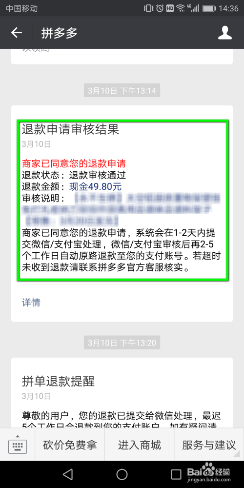 点击“提交申请”并被平台审核完成后我们就会收到一个“退款申请审核结果”的提示信息。在页面中我们可以查看相关处理的信息。