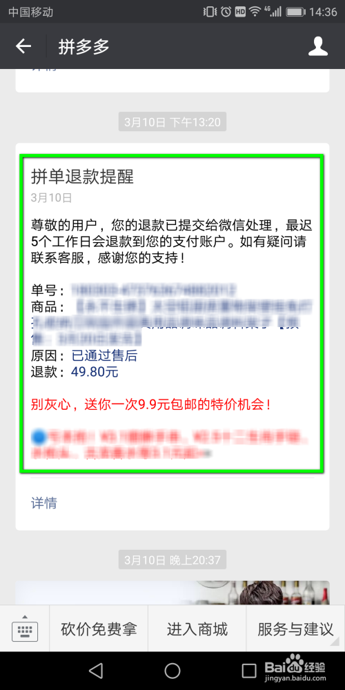 当退款完成后,我们又会收到一个“拼单退款提醒”,退款成功。