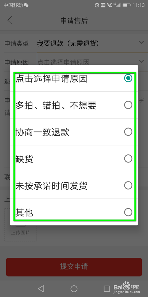 这时会弹出一个原因选择页面,在页面中选中你要进行退货退款的原因。