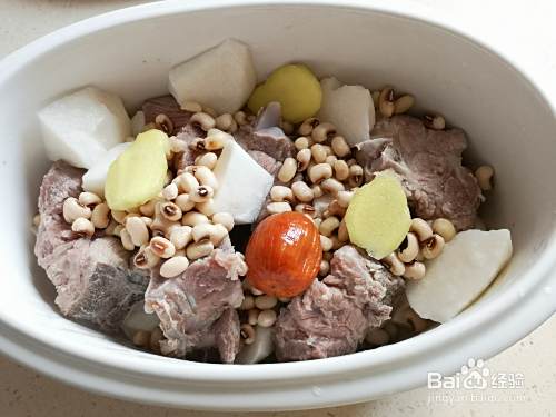 把所有的材料都放进炖菜里,加入红枣和姜片