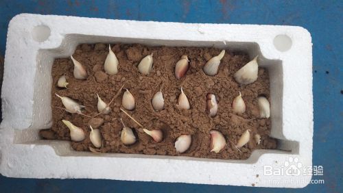 如图,把蒜瓣一个一个的插进土里,不能插的太拥挤哦。