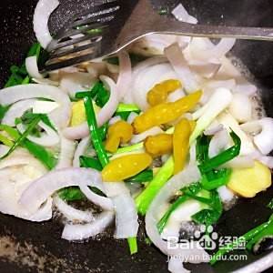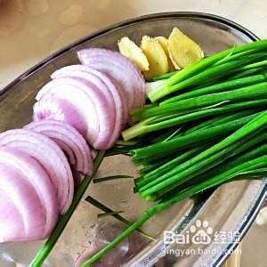 然后在蒸南瓜的时候,把姜切成薄片,葱切段,洋葱切成薄片准备下一步