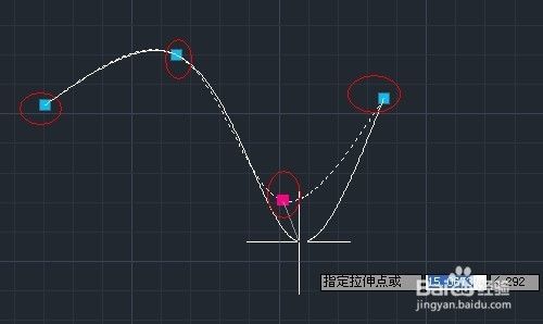 点击命令后,在图上点击一点,再移动鼠标再另外一处点击,如果需要几个点控制线的形状,那就点击几个点,最后三次连续按空格键确认样条曲线形状并退出命令。如果中途不想绘制了可以按ESC键退出命令。如果想改变这条线的形状,可以点击线条,出现夹点,鼠标点击夹点拖动夹点来控制线条的形状。