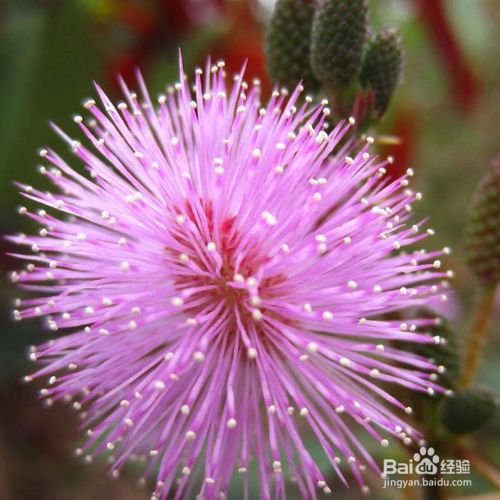 含羞草开花。 其花期为7~10月,从花蕾到开花需要5天左右。 开花后结荚,成熟后脱落。 花被浅紫色,粉红色,毛茸茸的,看起来很害羞。
