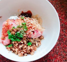 猪肉剁成馅,干香菇热水泡软洗净沥干水分切成碎末。