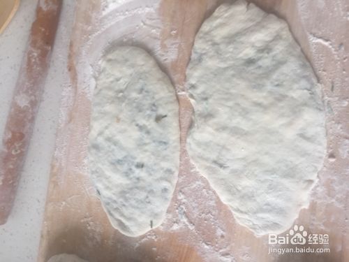 擀成饼皮,将酸菜馅包入其中,在擀成长形状的饼。
