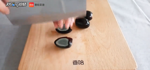 皮蛋去皮,用刀切四瓣。