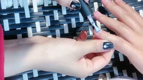 简单修理一下指甲。上完底胶,烤60秒。上第一层颜色。再烤一下。上第二层颜色。再次照光。贴一个这样漂亮的小花。DIY美甲制作完成。