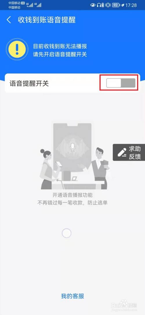 进入收钱到账语音提醒设置页面,点击开启【语音提醒开关】即可。