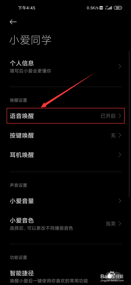 点击“小爱同学”后,然后点击选择“语音唤醒”。