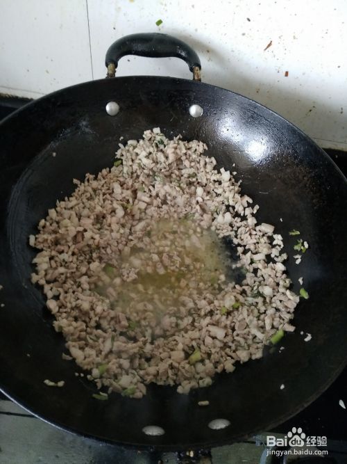 油锅烧热后,倒入切好的猪肉块,翻炒出香味,肉块变色,