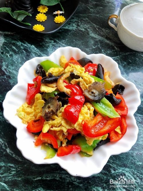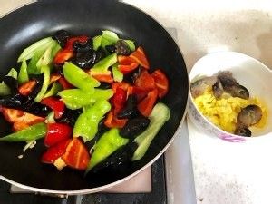 青红椒洗净切块;鸡蛋打散加入切碎的葱花;海参提前泡发切片;木耳提前泡发