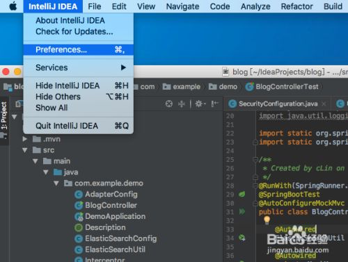 安装之前必须先打开IDEA,然后点击左上角Mac图标右边的IntelliJ IDEA按钮,在弹出的功能选项中点击Preferences…(快捷键command + ,),如下: