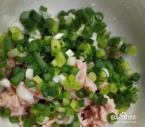 面粉加白砂糖酵母和水,和陈光滑面团。用湿布盖上松弛15分钟。火腿粒切碎粒,葱切葱花。
