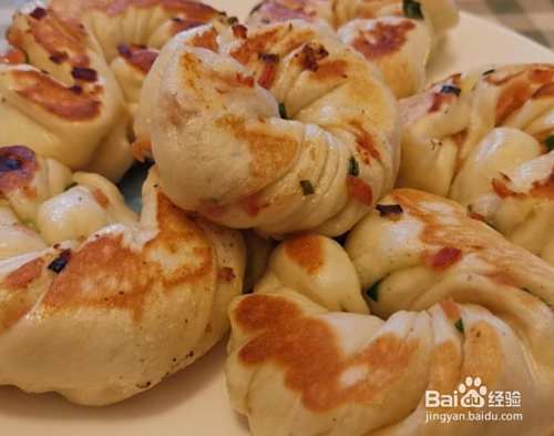 撒上火腿粒和葱花。两边往中间对叠。用刀切成小段。