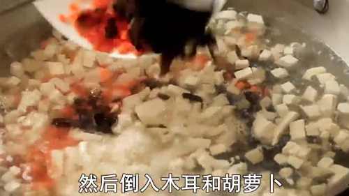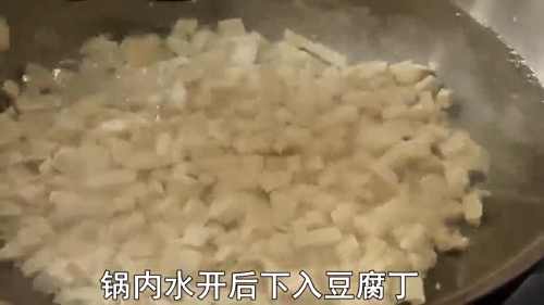 5起锅烧水,水开后倒入豆腐丁,撇去浮沫。