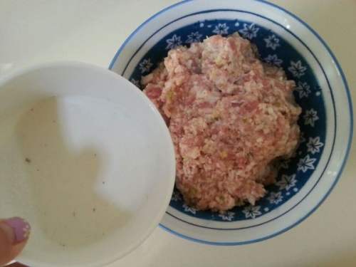在肉馅里加入淀粉水。30克红薯淀粉加入20克清水,融化好以后即成淀粉水。